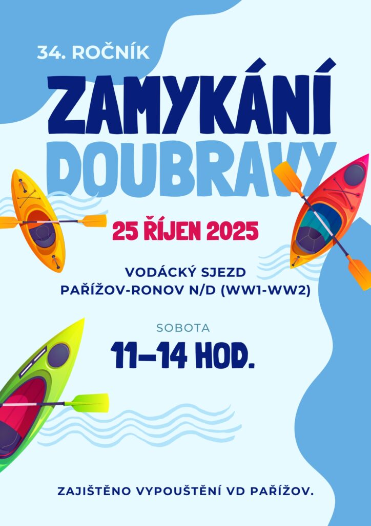 34. ročník vodáckého sjezdu Pařížov - Ronov n. D.(WW1-WW2), zajištěno vypouštění VD Pařížov mez 11:00 a 14:00 hodinou.