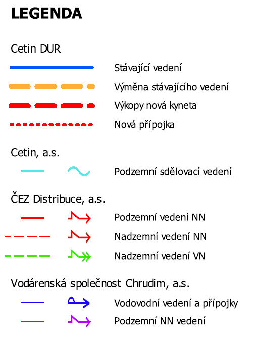 Fialová trasa (Stávající vedení): zde by nemělo docházet k výkopům, optický kabel by se měl zafukovat do existujících chrániček.